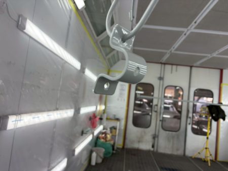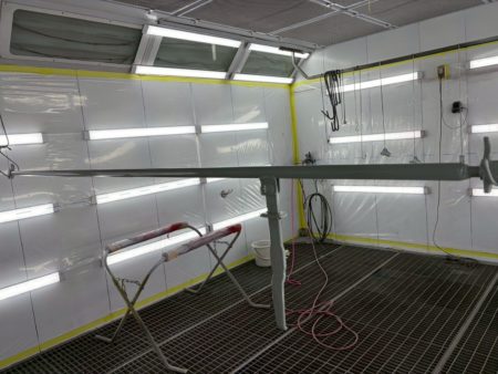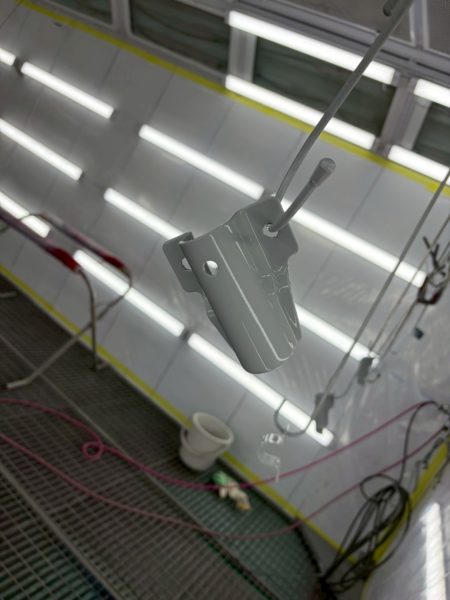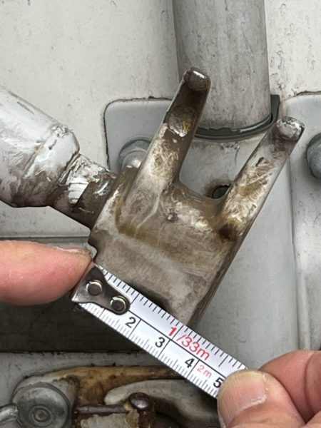 ▼丸パイプの固定ステーは曲がり修理後、塗装工程にうつります。
