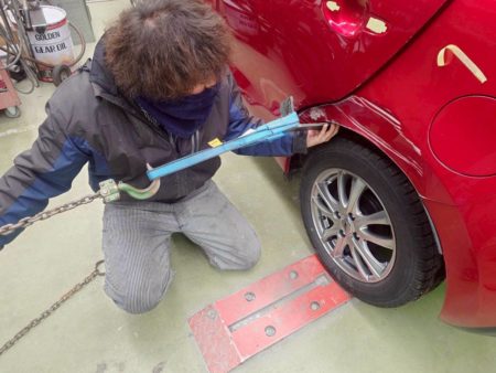 へこみの箇所に引き出し専用の金具を溶接し、力加減に注意しながら引き出していきます。