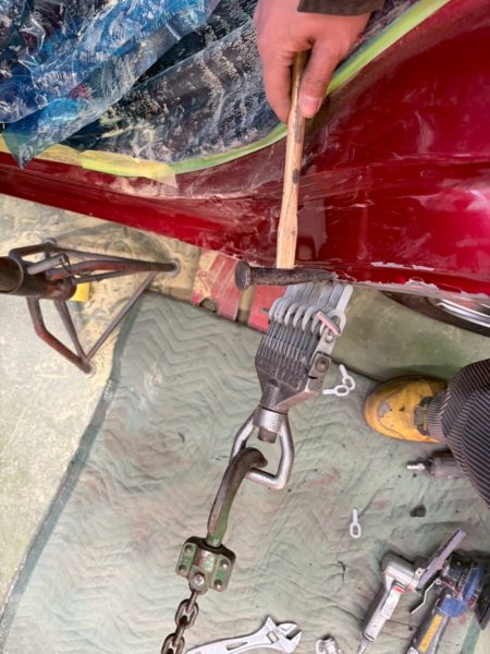 ▼パテを取りのぞいて鉄板が出たところで、金具を溶接し、専用の工具でへこみを引き出します。
